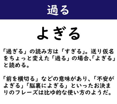 「過ぎる」の読み方は「すぎる」。送り仮名をちょっと変えた「過る」の場合、「よぎる」と読める。「前を横切る」などの意味があり、「不安がよぎる」「脳裏によぎる」といったお決まりのフレーズは比ゆ的な使い方のようだ。