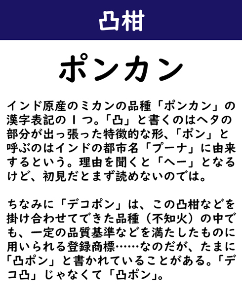 インド原産のミカンの品種「ポンカン」の漢字表記の1つ。「凸」と書くのはヘタの部分が出っ張った特徴的な形、「ポン」と呼ぶのはインドの都市名「プーナ」に由来するという。理由を聞くと「へー」となるけど、初見だとまず読めないのでは。ちなみに「デコポン」は、この凸柑などを掛け合わせてできた品種(不知火)の中でも、一定の品質基準などを満たしたものに用いられる登録商標……なのだが、たまに「凸ポン」と書かれていることがある。「デコ凸」じゃなくて「「凸ポン」。