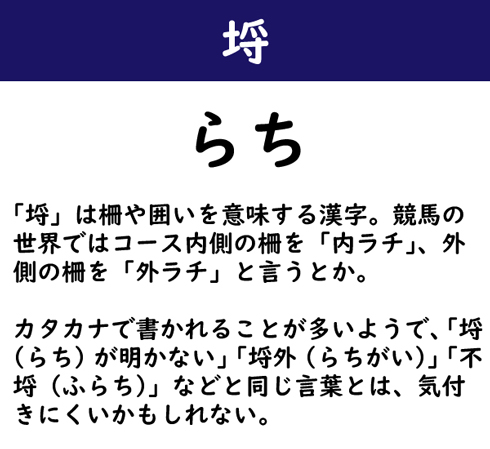 「埒」は柵や囲いを意味する漢字。競馬の世界ではコース内側の柵を「内ラチ」、外側の柵を「外ラチ」と言うとか。カタカナで書かれることが多いようで、「埒(らち)が明かない」「埒外(らちがい)」「不埒(ふらち)」などと同じ言葉とは、気付きにくいかもしれない。