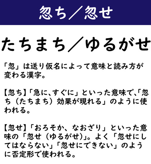 忽ち/忽せ:たちまち/ゆるがせ