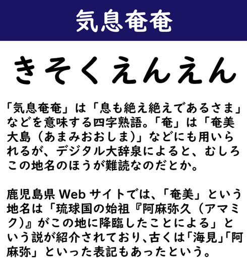 「気息奄奄」は「息も絶え絶えであるさま」などを意味する四字熟語。「奄」は「奄美大島(あまみおおしま)」などにも用いられるが、デジタル大辞泉によると、むしろこの地名のほうが難読なのだとか。鹿児島県Webサイトでは、「奄美」という地名は「琉球国の始祖『阿麻弥久(アマミク)』がこの地に降臨したことによる」という説が紹介されており、古くは「海見」「阿麻弥」といった表記もあったという。