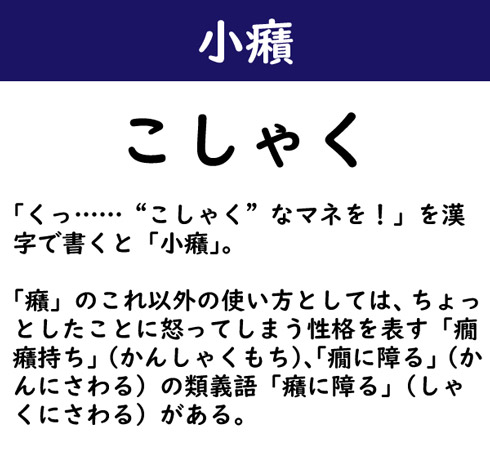 「くっ……“こしゃく”なマネを!」を漢字で書くと「小癪」。「癪」のこれ以外の使い方としては、ちょっとしたことに怒ってしまう性格を表す「癇癪持ち」(かんしゃくもち)、「癇に障る」(かんにさわる)の類義語「癪に障る」(しゃくにさわる)がある。