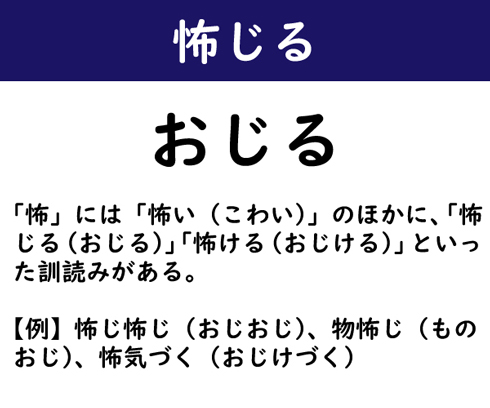 「怖」には「怖い(こわい)」のほかに、「怖じる(おじる)」「怖ける(おじける)」といった訓読みがある。【例】怖じ怖じ(おじおじ)、物怖じ(ものおじ)、怖気づく(おじけづく)。