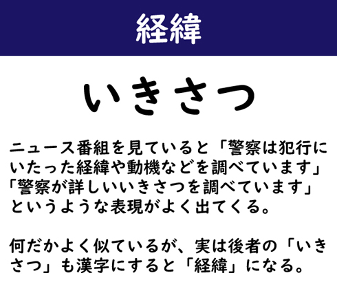 ニュース番組を見ていると「警察は犯行にいたった経緯や動機などを調べています」「警察が詳しいいきさつを調べています」というような表現がよく出てくる。何だかよく似ているが、実は後者の「いきさつ」も漢字にすると「経緯」になる。