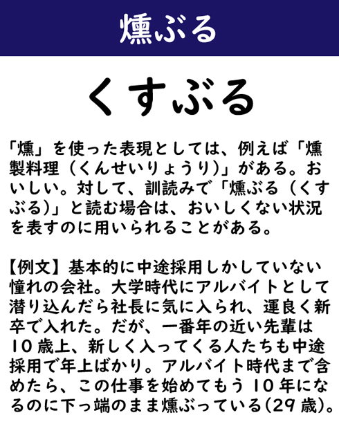 「燻」を使った表現としては、例えば「燻製料理(くんせいりょうり)」がある。おいしい。対して、訓読みで「燻ぶる(くすぶる)」と読む場合は、おいしくない状況を表すのに用いられることがある。【例文】基本的に中途採用しかしていない憧れの会社。大学時代にアルバイトとして潜り込んだら社長に気に入られ、運良く新卒で入れた。だが、一番年の近い先輩は10歳上、新しく入ってくる人たちも中途採用で年上ばかり。アルバイト時代まで含めたら、この仕事を始めてもう10年になるのに下っ端のまま燻ぶっている(29歳)。