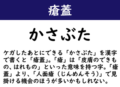 ケガしたあとにできる「かさぶた」を漢字で書くと「瘡蓋」。「瘡」は「皮膚のできもの、はれもの」といった意味を持つ字。「瘡蓋」より、「人面瘡(じんめんそう)」で見掛ける機会のほうが多いかもしれない。