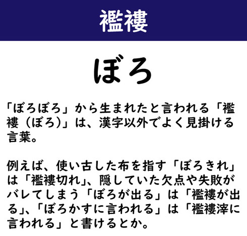 「ぼろぼろ」から生まれたと言われる「襤褸(ぼろ)」は、漢字以外でよく見掛ける言葉。例えば、使い古した布を指す「ぼろきれ」は「襤褸切れ」、隠していた欠点や失敗がバレてしまう「ぼろが出る」は「襤褸が出る」、「ぼろかすに言われる」は「襤褸滓に言われる」と書けるとか。