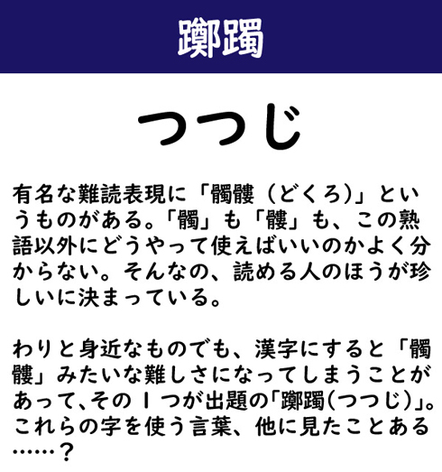 有名な難読表現に「髑髏(どくろ)」というものがある。「髑」も「髏」も、この熟語以外にどうやって使えばいいのかよく分からない。そんなの、読める人のほうが珍しいに決まっている。わりと身近なものでも、漢字にすると「髑髏」みたいな難しさになってしまうことがあって、その1つが出題の「躑躅(つつじ)」。これらの字を使う言葉、他に見たことある……?