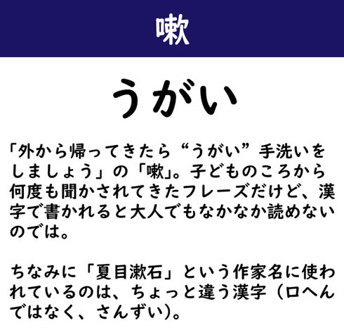 「外から帰ってきたら“うがい”手洗いをしましょう」の「嗽」。子どものころから何度も聞かされてきたフレーズだけど、漢字で書かれると大人でもなかなか読めないのでは。ちなみに「夏目漱石」という作家名に使われているのは、ちょっと違う漢字(口へんではなく、さんずい)。