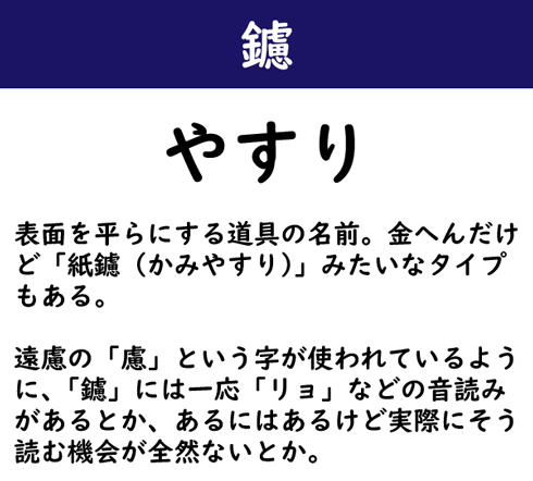 表面を平らにする道具の名前。金へんだけど「紙鑢(かみやすり)」みたいなタイプもある。遠慮の「慮」という字が使われているように、「鑢」には一応「リョ」などの音読みがあるとか、あるにはあるけど実際にそう読む機会が全然ないとか。