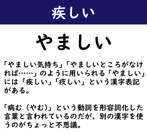「やましい気持ち」「やましいところがなければ……」のように用いられる「やましい」には「疾しい」「疚しい」という漢字表記がある。「病む(やむ)」という動詞を形容詞化した言葉と言われているのだが、別の漢字を使うのがちょっと不思議。