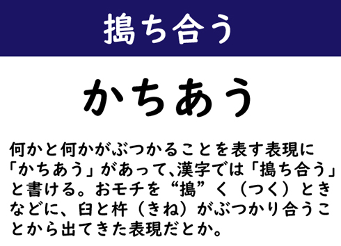 何かと何かがぶつかることを表す表現に「かちあう」があって、漢字では「搗ち合う」と書ける。おモチを“搗”く(つく)ときなどに、臼と杵(きね)がぶつかり合うことから出てきた表現だとか。