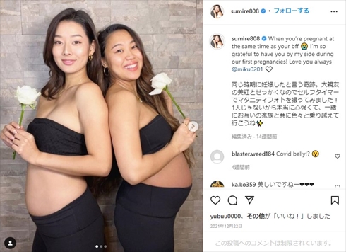 すみれさんは2021年11月、結婚&第1子妊娠を夫と抱き合う美しいウェディングフォトとともに報告。Instagramでは同時期に妊娠した親友との“Wマタフォト”の公開や、ファミリーカーの購入報告など、初めてのマタニティーライフを楽しむ姿を伝えています。