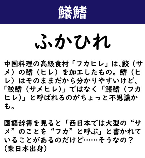 中国料理の高級食材「フカヒレ」は、鮫(サメ)の鰭(ヒレ)を加工したもの。鰭(ヒレ)はそのままだから分かりやすいけど、「鮫鰭(サメヒレ)」ではなく「鱶鰭(フカヒレ)」と呼ばれるのがちょっと不思議かも。国語辞書を見ると「西日本では大型の“サメ”のことを“フカ”と呼ぶ」と書かれていることがあるのだけど……そうなの?(東日本出身)