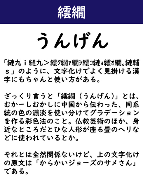 「縺九i縺九>繧ク繝ァ繝シ繧コ縺ョ繧オ繝。縺輔s」のように、文字化けでよく見掛ける漢字にもちゃんと使い方がある。ざっくり言うと「繧繝(うんげん)」とは、むかーしむかしに中国から伝わった、同系統の色の濃淡を使い分けてグラデーションを作る彩色法のこと。仏教芸術のほか、身近なところだとひな人形が座る畳のヘリなどに使われているとか。それとは全然関係ないけど、上の文字化けの原文は「からかいジョーズのサメさん」である。