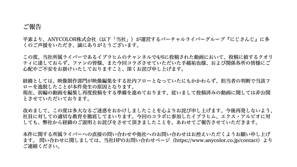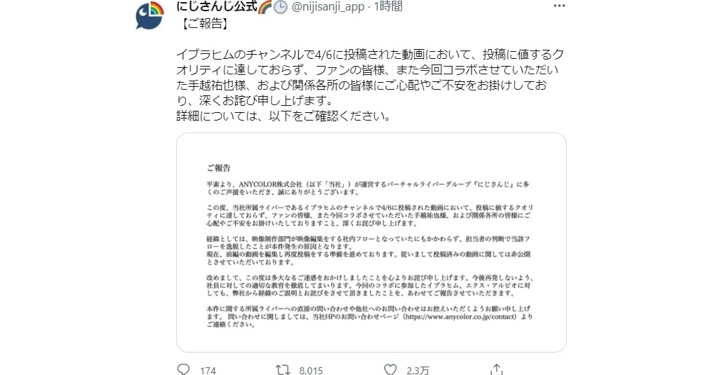 同社はコラボ先である手越さんをはじめとする関係者やファンに謝罪。加えて、動画に出演したにじさんじ所属のイブラヒムさんと、エクス・アルビオさんにも経緯の説明と謝罪を行ったことを明かしています。