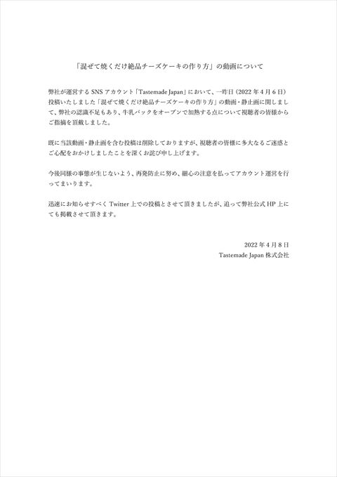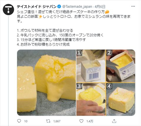 テイストメイドジャパンは4月8日、牛乳パックに生地を入れてオーブンで焼くチーズケーキのレシピについて、「危険では」とする視聴者からの指摘を受けて謝罪しました。