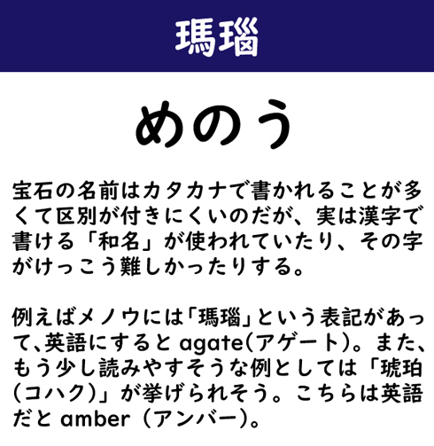 宝石の名前はカタカナで書かれることが多くて区別が付きにくいのだが、実は漢字で書ける「和名」が使われていたり、その字がけっこう難しかったりする。例えばメノウには「瑪瑙」という表記があって、英語にするとagate(アゲート)。また、もう少し読みやすそうな例としては「琥珀(コハク)」が挙げられそう。こちらは英語だとamber(アンバー)。