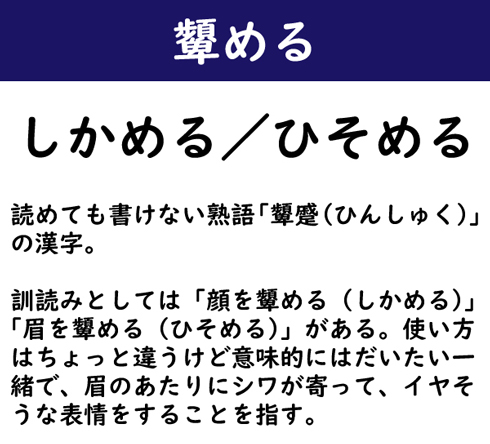 読めても書けない熟語「顰蹙(ひんしゅく)」の漢字。訓読みとしては「顔を顰める(しかめる)」「眉を顰める(ひそめる)」がある。使い方はちょっと違うけど意味的にはだいたい一緒で、眉のあたりにシワが寄って、イヤそうな表情をすることを指す。