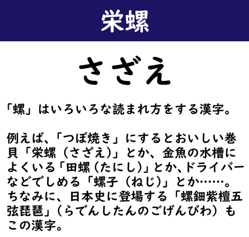 「螺」はいろいろな読まれ方をする漢字。例えば、「つぼ焼き」にするとおいしい巻貝「栄螺(さざえ)」とか、金魚の水槽によくいる「田螺(たにし)」とか、ドライバーなどでしめる「螺子(ねじ)」とか……。ちなみに、日本史に登場する「螺鈿紫檀五弦琵琶」(らでんしたんのごげんびわ)もこの漢字。