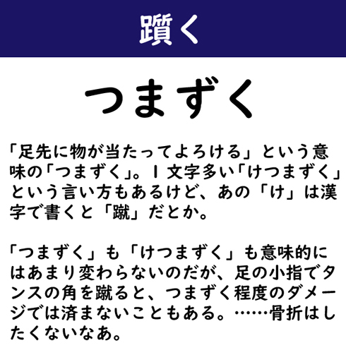 「足先に物が当たってよろける」という意味の「つまずく」。1文字多い「けつまずく」という言い方もあるけど、あの「け」は漢字で書くと「蹴」だとか。「つまずく」も「けつまずく」も意味的にはあまり変わらないのだが、足の小指でタンスの角を蹴ると、つまずく程度のダメージでは済まないこともある。……骨折はしたくないなあ。