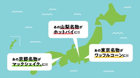 桔梗信玄餅(山梨県)をパイとして表現した「桔梗信玄餅パイ」は、パイにきな粉もちフィリングと黒蜜フィリングを詰め込んだスイーツ。辻利の抹茶(京都)とのコラボスイーツは、宇治抹茶の味わいの「マックシェイク辻利抹茶ラテ」、東京ばな奈(東京)とのコラボスイーツは、ソフトクリームにバナナカスタードソースとアーモンドをプラスした「ワッフルコーン 東京ばな奈」となっています。
