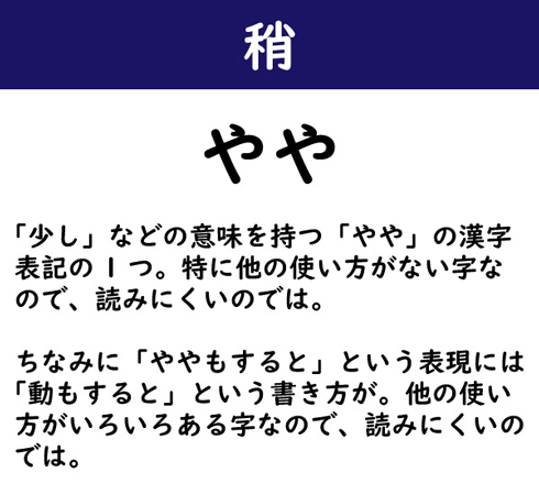 「少し」などの意味を持つ「やや」の漢字表記の1つ。特に他の使い方がない字なので、読みにくいのでは。ちなみに「ややもすると」という表現には「動もすると」という書き方が。他の使い方がいろいろある字なので、読みにくいのでは。