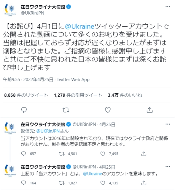 問題のアカウント「@Ukraine」は4月1日にヒトラー、ムッソリーニ、昭和天皇の写真とともに「ファシズムとナチズムは1945年に打倒された」という文章を並べた動画を投稿。動画は23日ごろから日本で拡散し、反発を招きました。これを受け、同アカウントは動画を削除した上で、「以前のバージョンでのミスに心からおわびします。日本の友好的な人々を不快にさせる意図はありませんでした」と謝罪しました。