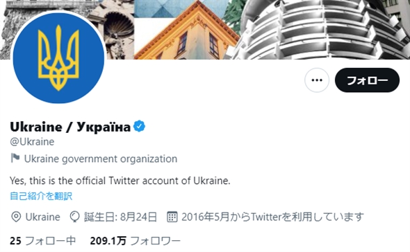 「@Ukraine」は現在、Twitter社による「政府および国家当局関係メディアアカウント」用のラベルを正式に受けたアカウントであり、フォロワー数は209万人以上にも上ります。