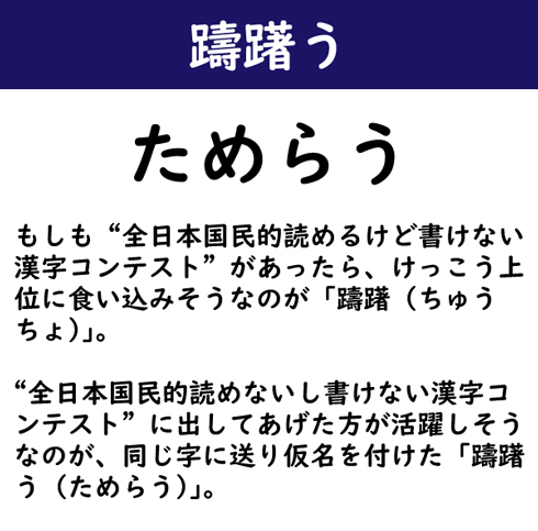 もしも“全日本国民的読めるけど書けない漢字コンテスト”があったら、けっこう上位に食い込みそうなのが「躊躇(ちゅうちょ)」。“全日本国民的読めないし書けない漢字コンテスト”に出してあげた方が活躍しそうなのが、同じ字に送り仮名を付けた「躊躇う(ためらう)」。