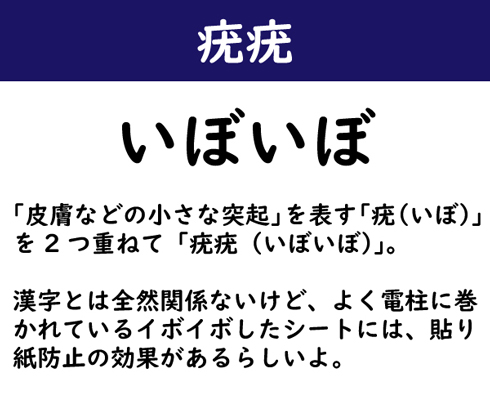 「皮膚などの小さな突起」を表す「疣(いぼ)」を2つ重ねて「疣疣(いぼいぼ)」。漢字とは全然関係ないけど、よく電柱に巻かれているイボイボしたシートには、貼り紙防止の効果があるらしいよ。