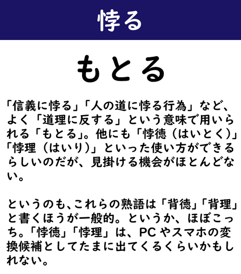 「信義に悖る」「人の道に悖る行為」など、よく「道理に反する」という意味で用いられる「もとる」。他にも「悖徳(はいとく)」「悖理(はいり)」といった使い方ができるらしいのだが、見掛ける機会がほとんどない。というのも、これらの熟語は「背徳」「背理」と書くほうが一般的。というか、ほぼこっち。「悖徳」「悖理」は、PCやスマホの変換候補としてたまに出てくるくらいかもしれない。