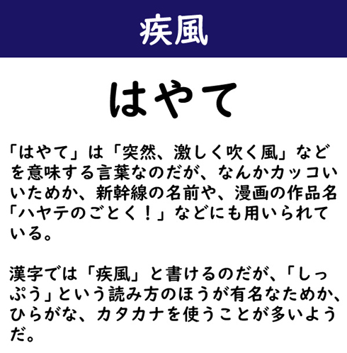 「はやて」は「突然、激しく吹く風」などを意味する言葉なのだが、なんかカッコいいためか、新幹線の名前や、漫画の作品名「ハヤテのごとく!」などにも用いられている。漢字では「疾風」と書けるのだが、「しっぷう」という読み方のほうが有名なためか、ひらがな、カタカナを使うことが多いようだ。