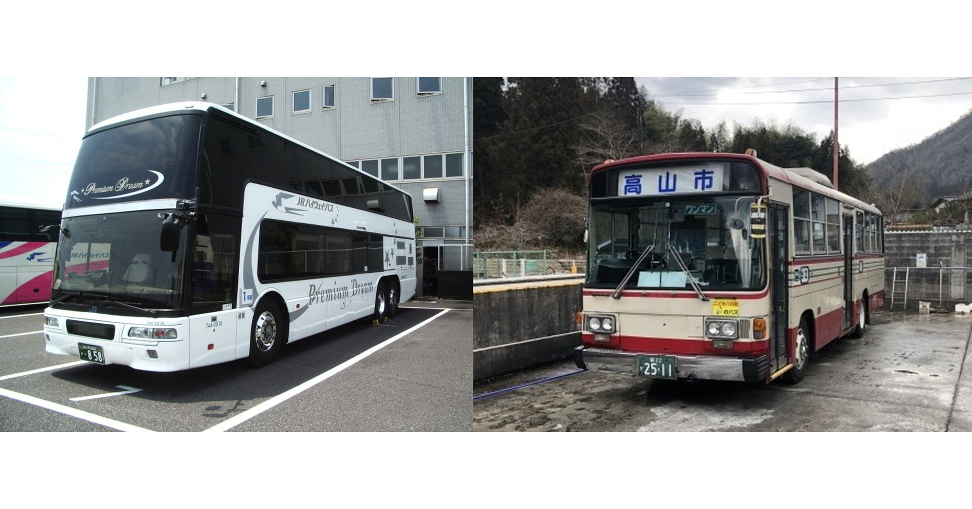 ツアーは大阪発着の日帰り行程です。西日本ジェイアールバスが保有する国産二階建てバス「三菱ふそう エアロキング」のプレミアムドリーム車(BKG-MU66JS、2010年式)と、備北バス(岡山県)が保有する1987年式の路線バス車両「2511号車」(日産ディーゼルP-RM81G+富士重工製6E架装車)に貸切乗車します。