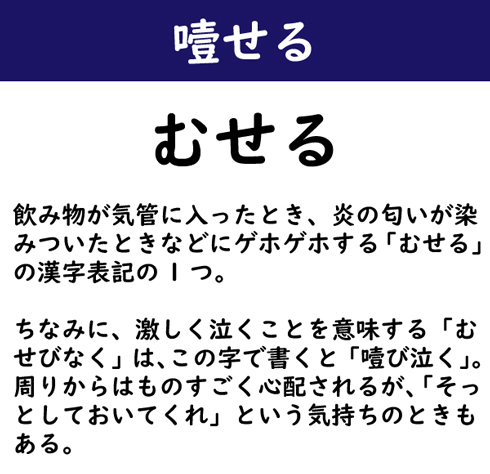 飲み物が気管に入ったとき、炎の匂いが染みついたときなどにゲホゲホする「むせる」の漢字表記の1つ。ちなみに、激しく泣くことを意味する「むせびなく」は、この字で書くと「噎び泣く」。周りからはものすごく心配されるが、「そっとしておいてくれ」という気持ちのときもある。