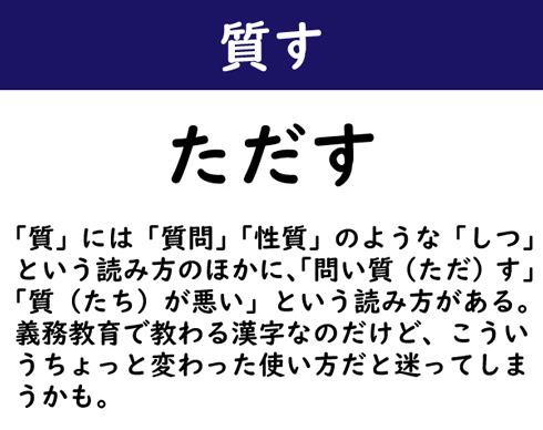 「質」には「質問」「性質」のような「しつ」という読み方のほかに、「問い質(ただ)す」「質(たち)が悪い」という読み方がある。義務教育で教わる漢字なのだけど、こういうちょっと変わった使い方だと迷ってしまうかも。