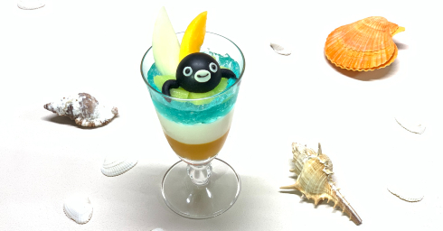 Suicaのペンギンスイーツもトロピカルテイストに。ドライパインとピスタチオクリームが入った「Suicaのペンギン マカロン」や、コーヒーゼリーとココナッツクリームを使用した「Suicaのペンギン ゼリー」など、かわいさとおいしさが楽しめるメニューが登場します。