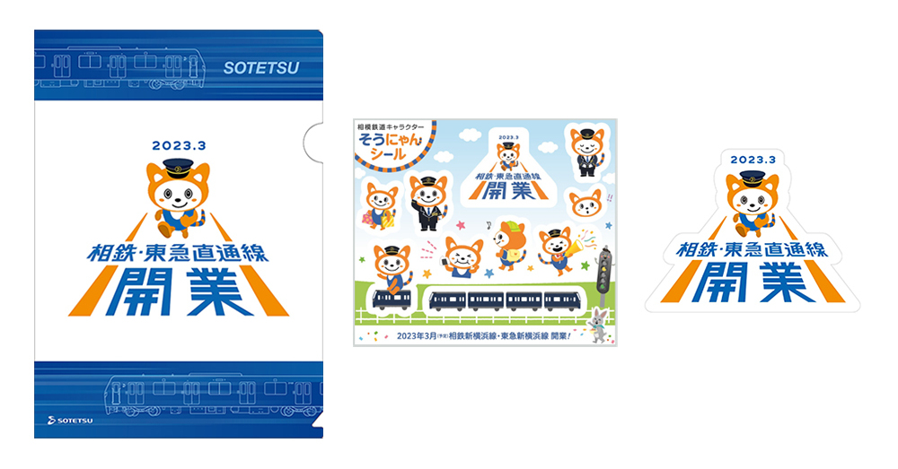 「相鉄・東急直通線 開業PRロゴ(そうにゃん)」クリアファイル(左)シール(中央・右)