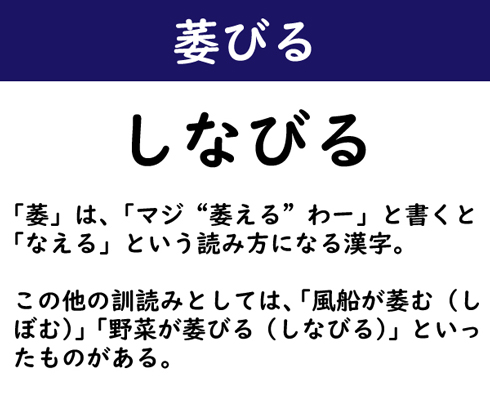 「萎」は、「マジ“萎える”わー」と書くと「なえる」という読み方になる漢字。この他の訓読みとしては、「風船が萎む(しぼむ)」「野菜が萎びる(しなびる)」といったものがある。