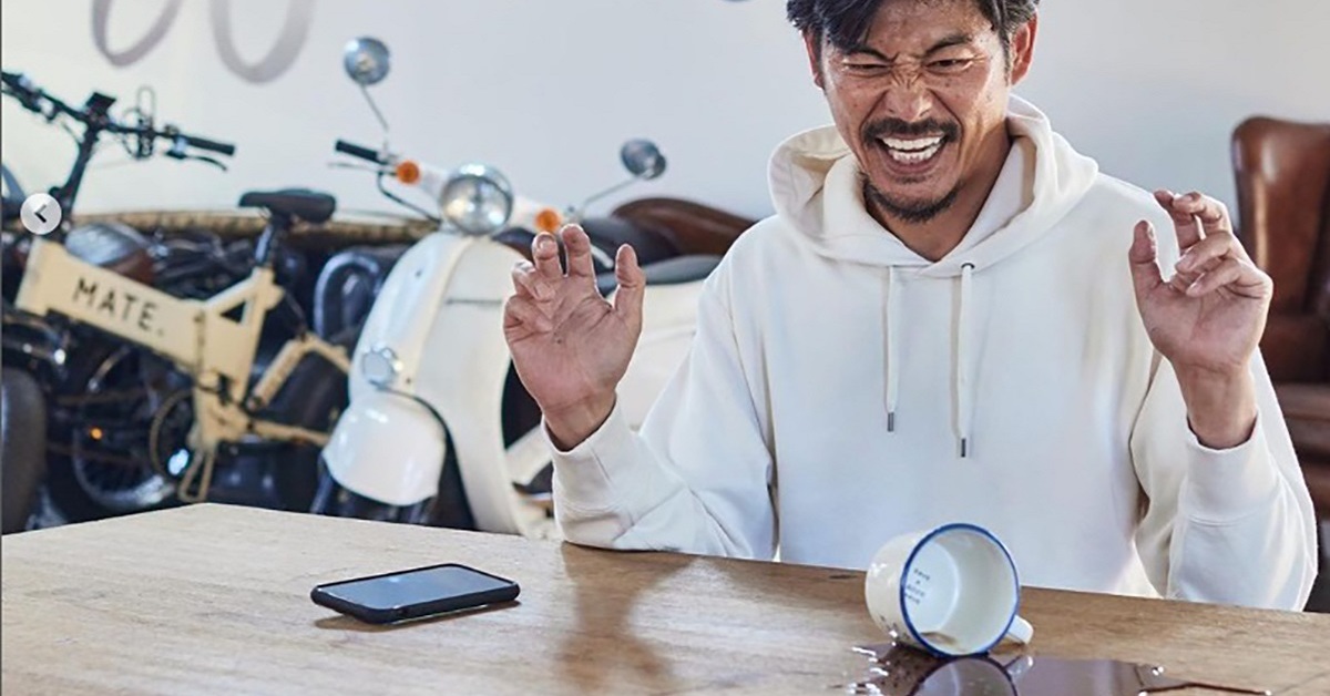 合計6枚に及ぶ写真では、スマホ画面を笑顔で見ていた坂口さんが手元のコーヒーカップを盛大にひっくり返し、眼前の“惨状”に心底ウンザリしたような表情を披露。頭に手をやってしんどそうに熟考する中、良いアイデアを考えついたという体で、フーディーを得意げに着てみせるという物語がいささかコメディータッチの演技とともに展開されています。