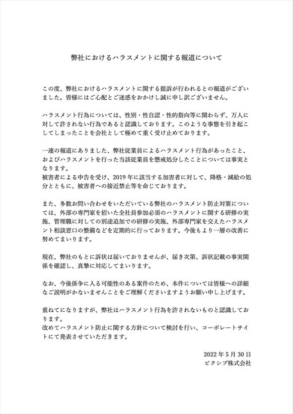 同社におけるハラスメント行為に対する提訴が報道されていました。
