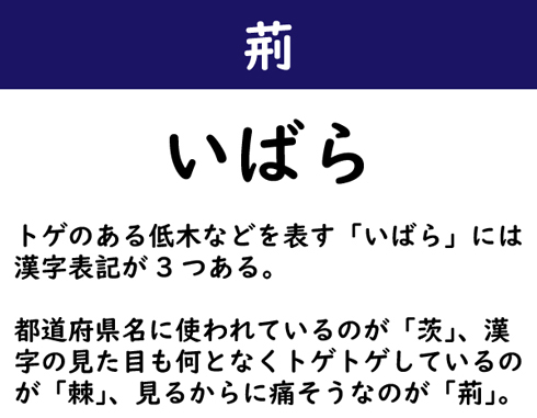 トゲのある低木などを表す「いばら」には漢字表記が3つある。都道府県名に使われているのが「茨」、漢字の見た目も何となくトゲトゲしているのが「棘」、見るからに痛そうなのが「荊」。