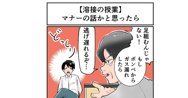 聞けば思わず背筋がピーンと伸びてしまう……そんな含蓄のあるツイートをイラストを交えて紹介するコーナー「気をつけましょう」。今回は、溶接の授業で聞いた、背骨のあたりがヒヤリと冷たくなるお話です。