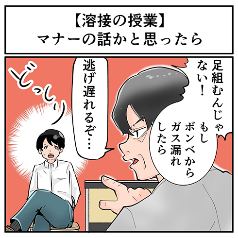 溶接の授業で足組みながら話聞いてたら先生が「足組むんじゃない」って叱るから礼儀とか厳しいのかなーって思ったんですよ。そしたら「足組んだりポケットに手を入れたりするな。もしボンベがガス漏れして一酸化炭素中毒や酸欠になったらそういう奴から逃げ遅れる」ってほんとにあった怖い話はじめた