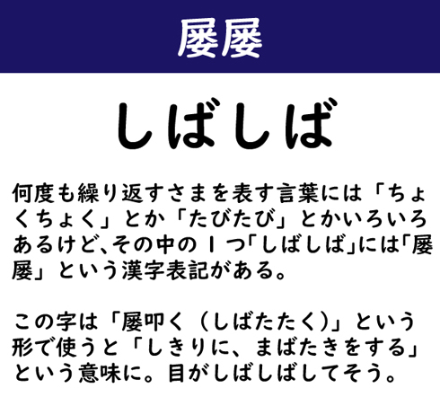 何度も繰り返すさまを表す言葉には「ちょくちょく」とか「たびたび」とかいろいろあるけど、その中の1つ「しばしば」には「屡屡」という漢字表記がある。この字は「屡叩く(しばたたく)」という形で使うと「しきりに、まばたきをする」という意味に。目がしばしばしてそう。