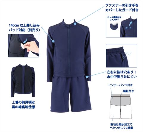 パッドを入れられる仕様が必要な生徒には、パッドが差し込めるポケットをつけているものの、裏地を黒にしてパッと見て分からないような仕上げに。またパンツはインナーパンツ付きで、体に密着しない生地を使用、左右に抜け穴を付けて水中で膨らみにくくくしています。