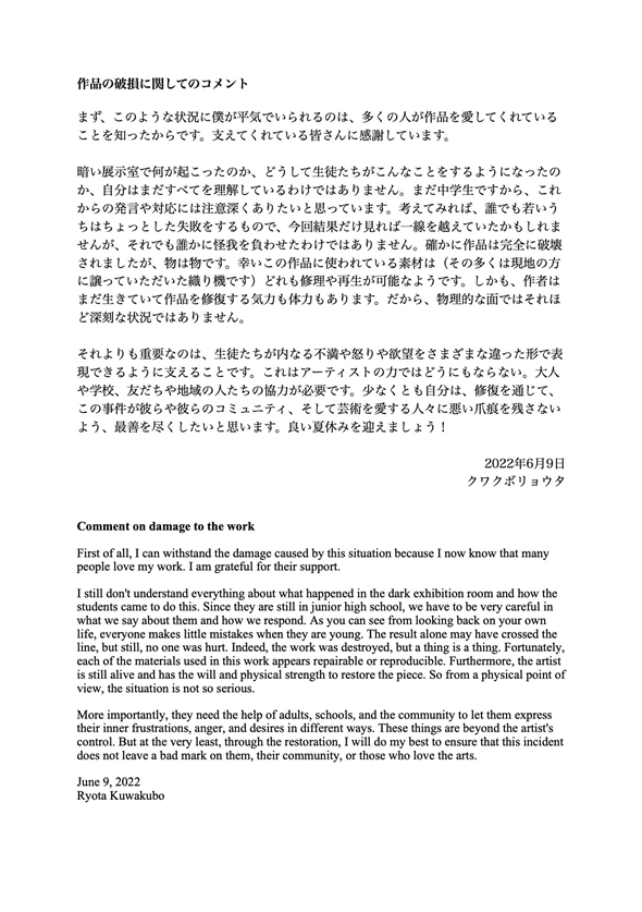 中学生らが作品を破壊した事実については「一線を越えていたかもしれません」としつつも、「物は物です」とした上で、作品に使われている素材がどれも修理や再生が可能で、作者自身も修復する気力も体力もあることから「物理的な面ではそれほど深刻な状況ではありません」とつづり、「修復を通じて、この事件が彼らや彼らのコミュニティ、そして芸術を愛する人々に悪い爪痕を遺さないよう、最善を尽くしたいと思います。良い夏休みを迎えましょう!」と、前向きな一文で結んでいます。