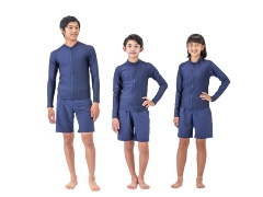 水着のパターン(型)は通常の水着をもとに、1枚で着ても体の線が出にくく、かつ泳ぎを妨げないよう適度にフィットする形をベテランのパタンナーに依頼。胸パッドを入れるポケットの裏地を黒くして目立たなくするなど細かな部分に配慮し、男女どちらが着ても違和感なく、必要な仕様が備わっているよう仕上げたとのことです。