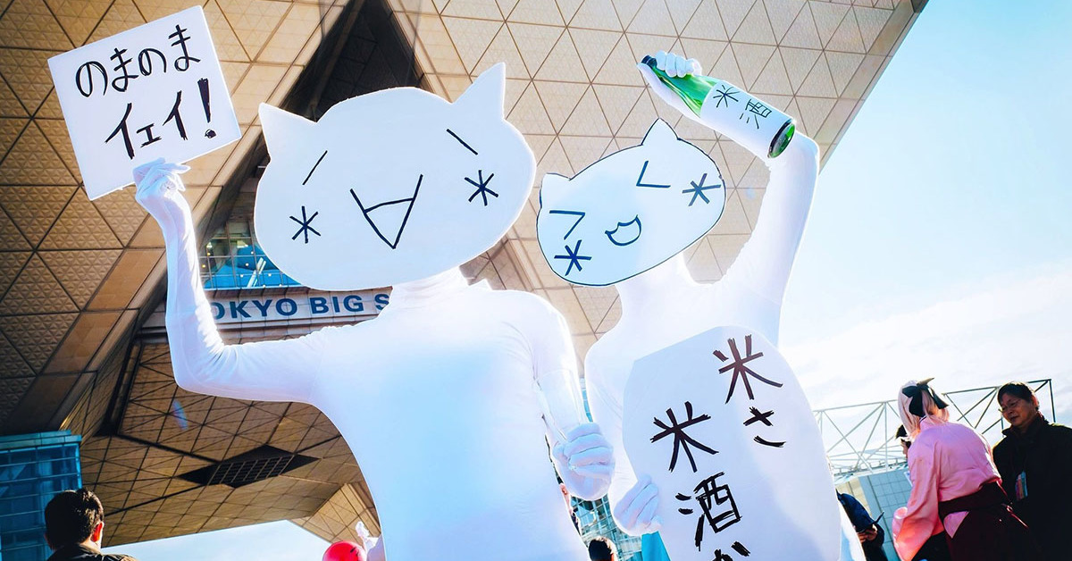ツイートをしたのは、コスプレイヤーとして活動する宇佐見坂うさりさん。投稿された画像には、「恋のマイアヒ」のキャラが「のまのまイェイ」「米(ベイ)さ米酒(ベイシュ)か」と同曲の空耳の歌詞を書いた紙を持ち、のりのりで写っています。