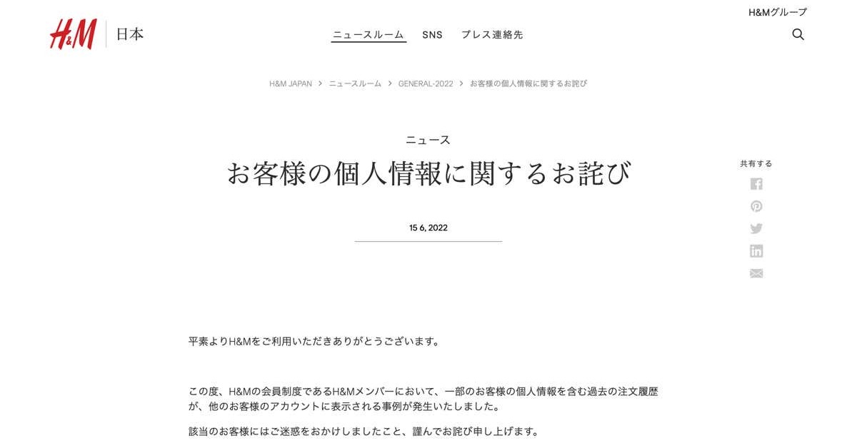 H&M Japan公式サイト「お客様の個人情報に関するお詫び」(全文)